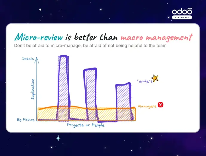 Odoo grows leaders from within, avoiding external director hires. Promotions go to the best performers — people who excel at the work and have the drive to elevate and teach others. The core criterion is usefulness to the team — neither seniority nor an ambition to “manage people.” Ego is treated as a barrier to collaboration and a threat to team spirit.